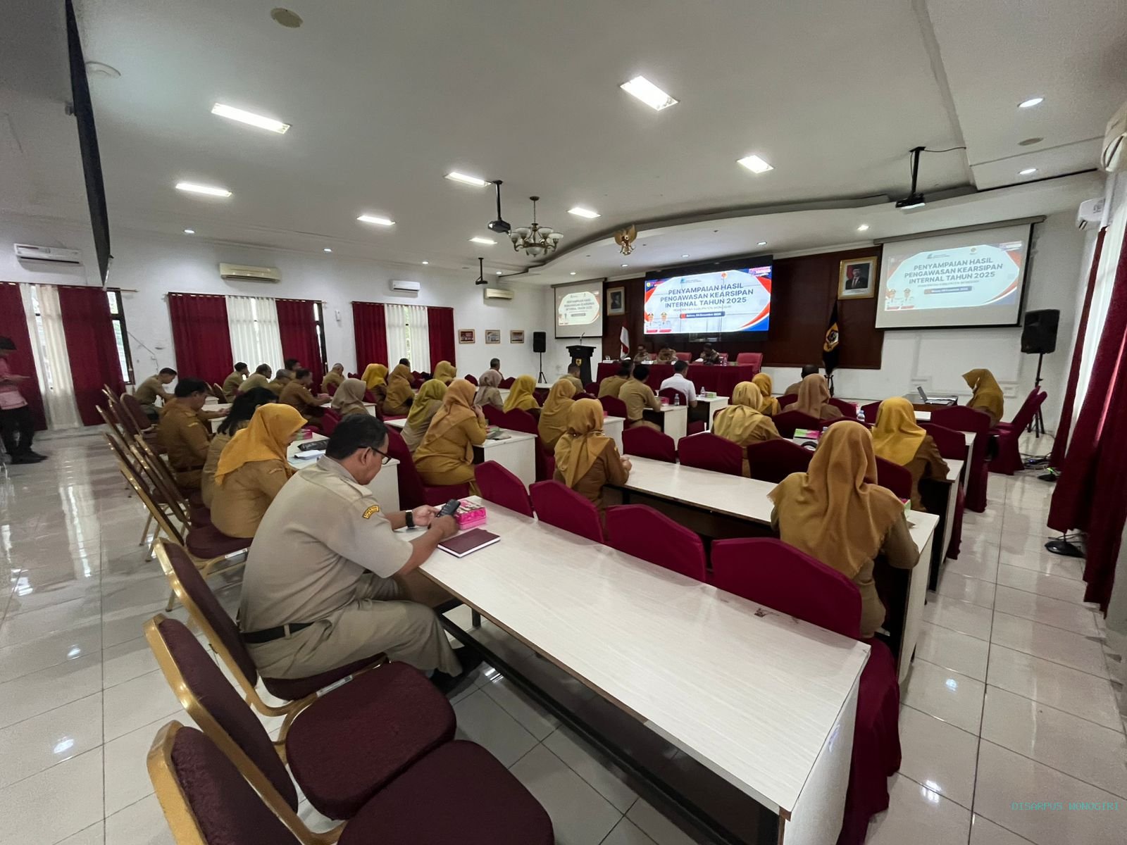 Wonogiri— Pemerintah Kabupaten Wonogiri melalui Dinas Kearsipan dan Perpustakaan menyelenggarakan kegiatan Penyampaian Hasil Pengawasan Kearsipan Internal Tahun 2025 sebagai bentuk evaluasi atas penyelenggaraan kearsipan pada 27 perangkat daerah di Kabupaten Wonogiri pada 09 Desember 2025. Kegiatan ini bertujuan memastikan bahwa pengelolaan arsip berjalan sesuai prinsip akuntabilitas, transparansi, serta mendukung terwujudnya transformasi digital di lingkungan pemerintah daerah. Laporan hasil pengawasan disampaikan oleh Kepala Dinas Kearsipan dan Perpustakaan Kabupaten Wonogiri, Mawan Tri Hananto, SSTP, M.Si. Dalam laporannya, disebutkan bahwa pengawasan mencakup evaluasi terhadap penciptaan arsip, penggunaan aplikasi SRIKANDI, pengelolaan arsip aktif dan inaktif, serta pemenuhan standar penyusutan arsip. Hasil pengawasan menunjukkan adanya peningkatan kualitas penyelenggaraan kearsipan di sejumlah perangkat daerah