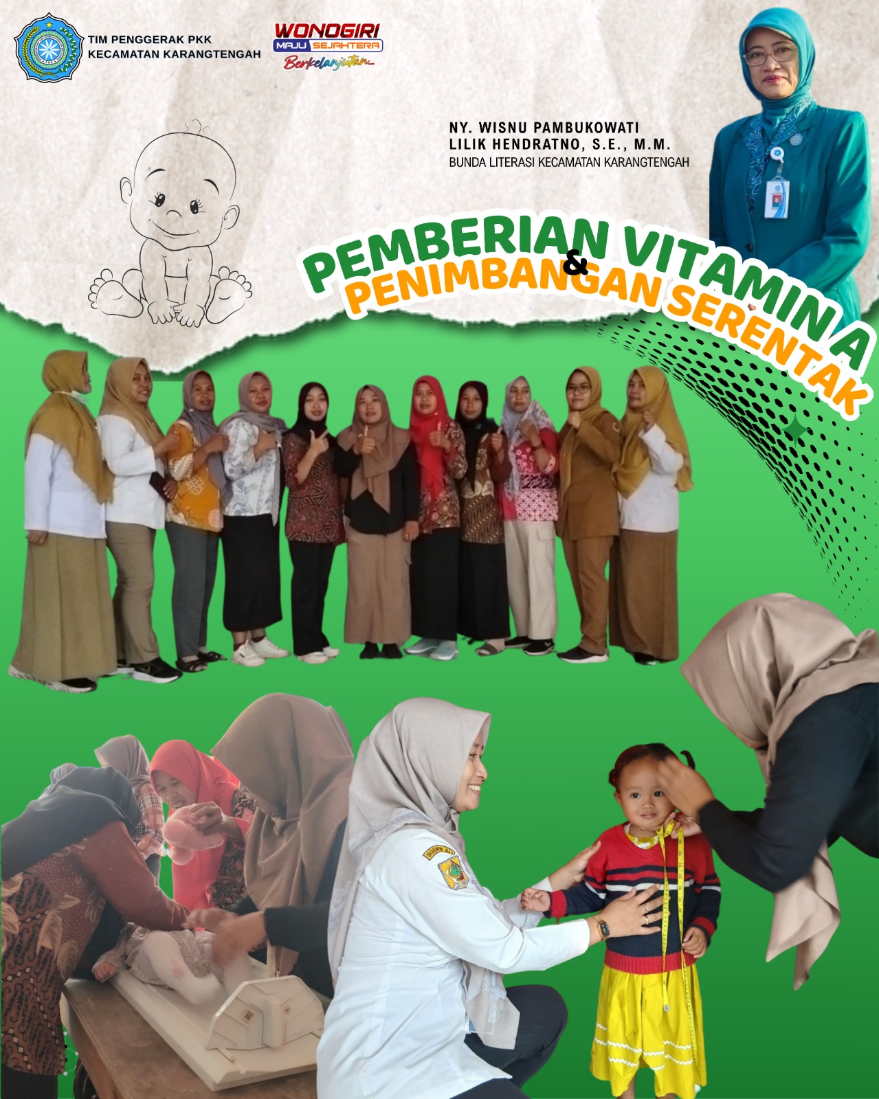 Senin (09/02/2026) – Bunda Literasi Kecamatan Karangtengah Ny. Wisnu Pambukowati Lilik Hendratno, S.E., M.M. terlibat langsung dalam Bulan Aksi Penimbangan Balita Serentak dan Pemberian Vitamin A di Balai Desa Karangtengah. Bulan Penimbangan Serentak (BPS) dan pemberian Vitamin A dilaksanakan dua kali dalam setahun, yaitu pada bulan Februari dan Agustus. Kegiatan ini bertujuan untuk memantau pertumbuhan anak secara berkala serta mencegah kekurangan Vitamin A yang dapat mengganggu daya tahan tubuh dan kesehatan mata anak.