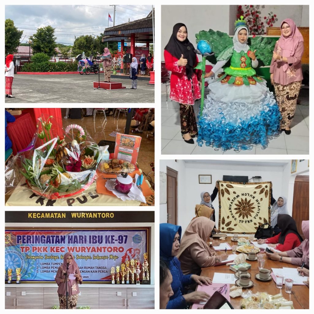 Dalam rangka memperingati Hari Ibu Tahun 2025, TP PKK dan DWP Kecamatan Wuryantoro bersama TP PKK desa dan kelurahan mengadakan lomba kreatif yang meliputi pembuatan tumpeng berprinsip B2SA (Beragam, Bergizi, Seimbang, dan Aman), kerajinan taplak dari kain perca, serta fashion show baju hasil daur ulang limbah rumah tangga. Kegiatan yang bertempat di Pendopo Kecamatan Wuryantoro ini diawali dengan apel pagi bersama yang dipimpin oleh Ibu Wakil Bupati Wonogiri, Ibu Ayu Imron Riskiyarno, dan dihadiri oleh Ketua DWP Kabupaten serta perwakilan pokja TP PKK Kabupaten Wonogiri.