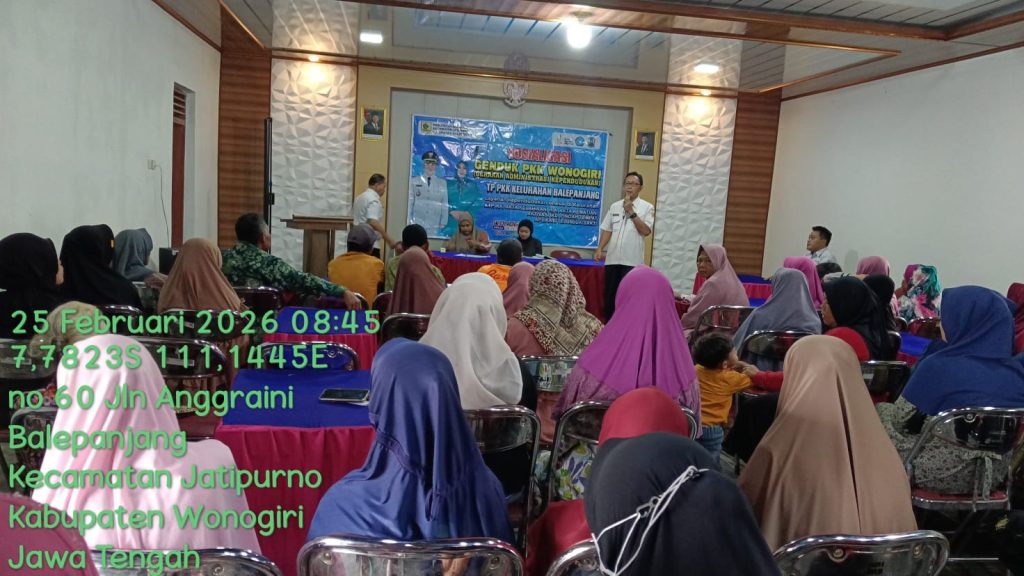 Pada hari Rabu, 25 Februari 2026, TP PKK Kelurahan Balepanjang Kecamatan Jatipurno melaksanakan kegiatan Sosialisasi GENDUK PKK (Gerakan Sadar Administrasi Kependudukan) yang bertempat di Ruang Aula Kelurahan Balepanjang, Kecamatan Jatipurno dengan jumlah peserta sekitar 100 orang yang terdiri dari kader PKK, perangkat desa, serta Masyarakat Kelurahan Balepanjang.
