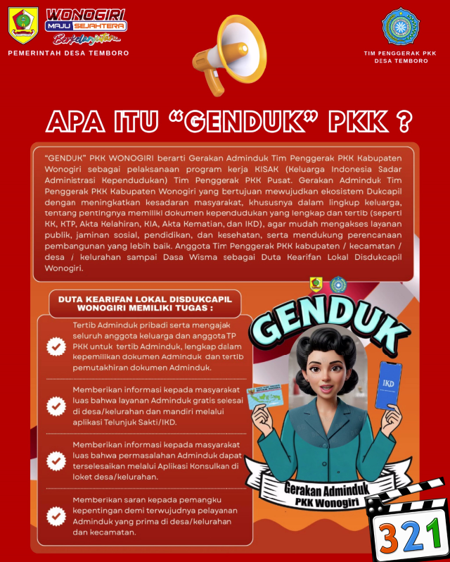 Genduk PKK Wonogiri berarti Gerakan Adminduk Tim Penggerak PKK Kabupaten Wonogiri sebagai pelaksanaan program kerja Keluarga Indonesia Sadar Administrasi Kependudukan Tim Penggerak PKK Pusat. Gerakan Adminduk Tim Penggerak PKK Kabupaten Wonogiri bertujuan mewujudkan ekosistem Dukcapil dengan meningkatkan kesadaran masyarakat, khususnya dalam lingkup keluarga, tentang pentingnya memiliki dokumen kependudukan yang lengkap dan tertib seperti Kartu Keluarga, Kartu Tanda Penduduk, Akta Kelahiran, Kartu Identitas Anak, Akta Kematian dan Identitas Kepandudukan Digital, agar mudah mengakses layanan publik, jaminan sosial, pendidikan, dan kesehatan, serta mendukung perencanaan pembangunan yang lebih baik.