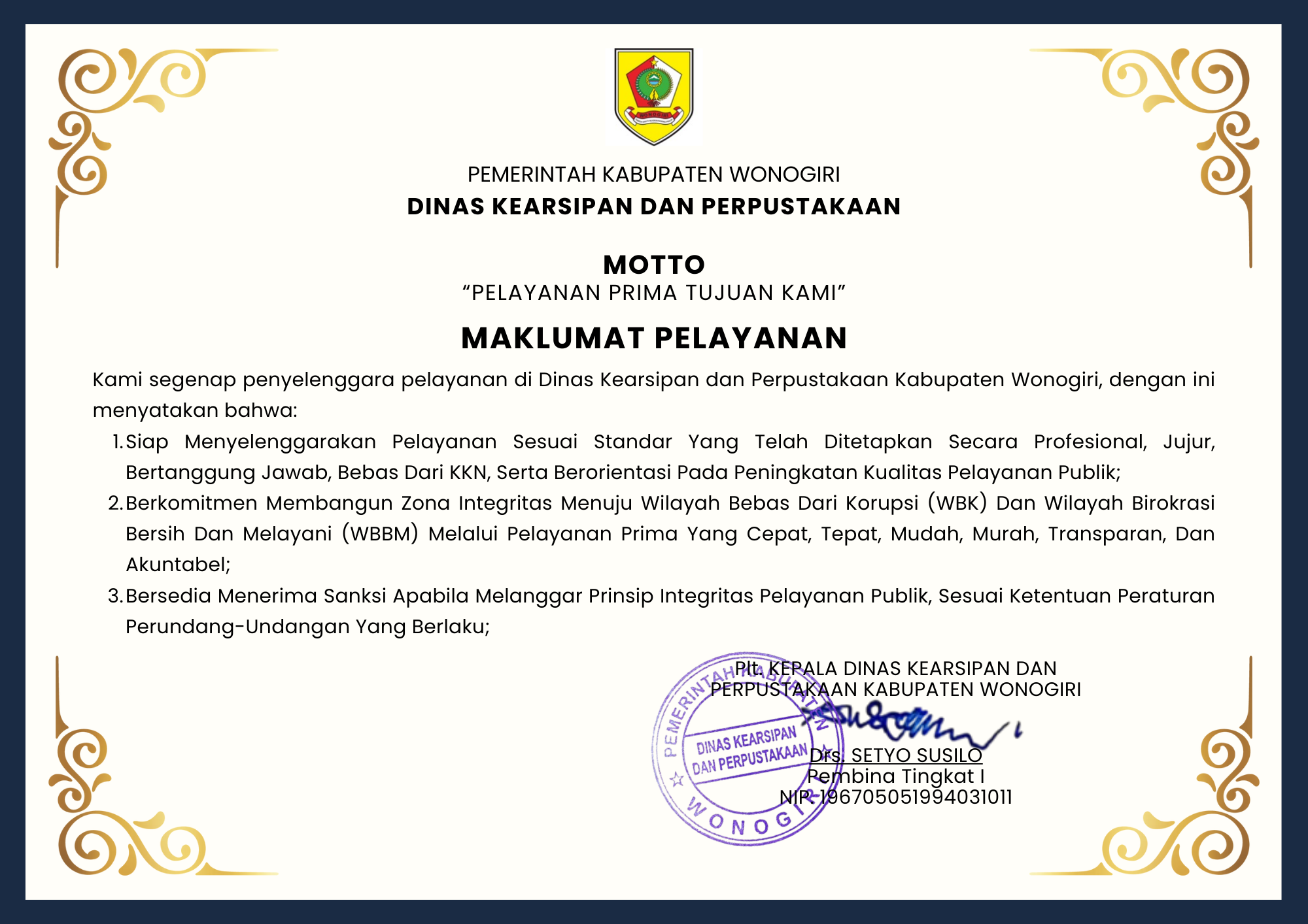Kami segenap penyelenggara pelayanan di Dinas Kearsipan dan Perpustakaan Kabupaten Wonogiri, dengan ini menyatakan bahwa:
